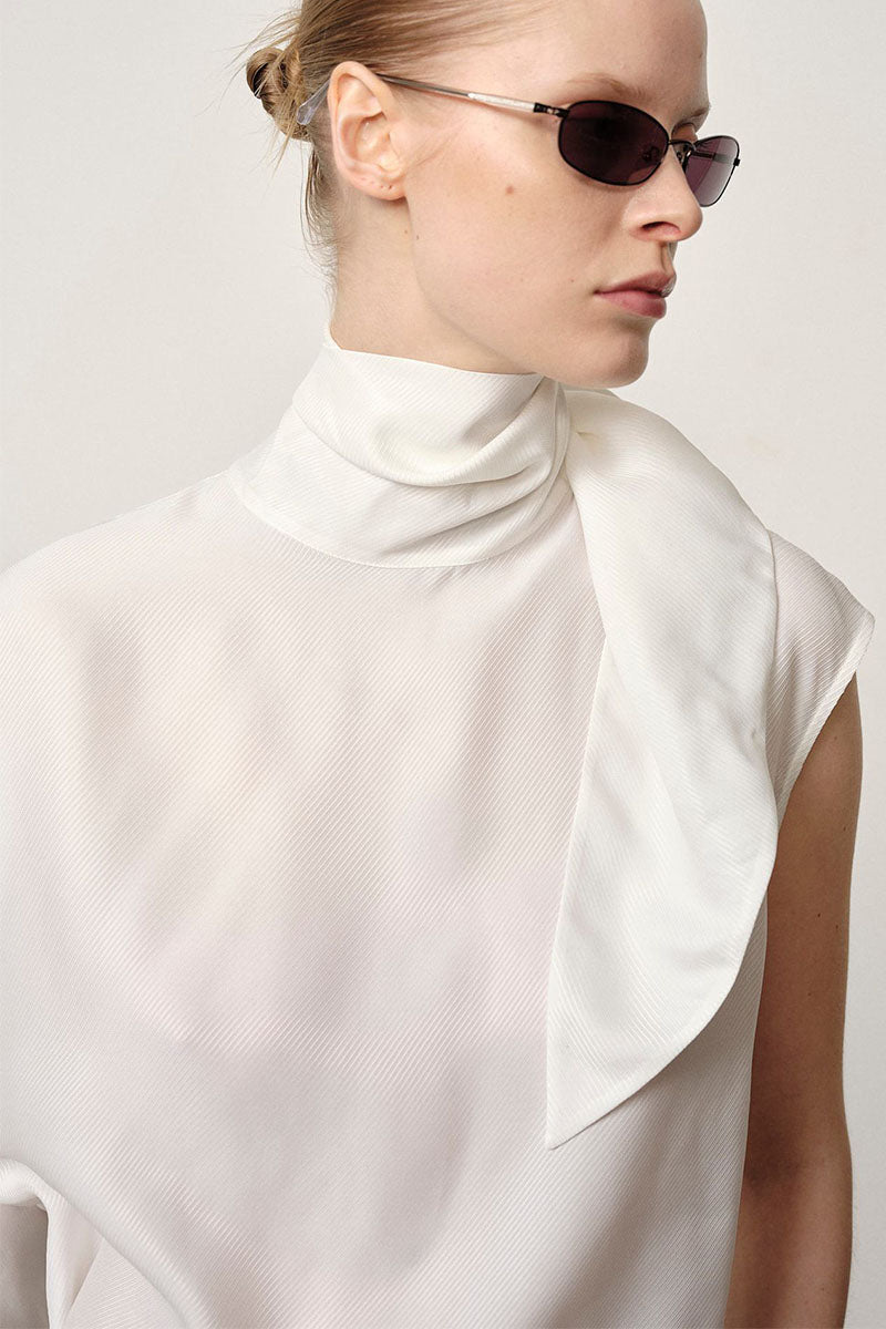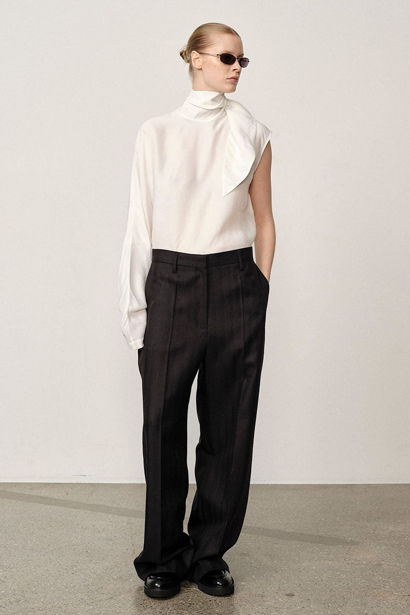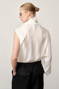 Introducing the Maja Blouse: A lightweight, slightly sheer asymmetrical blouse with a single long sleeve, finished with a soft tie collar for an elegant touch.