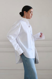 - Oversized tailored shirt with drop shoulder. Box center pleat at back, with rounded hem and extended tail. Shell buttons.