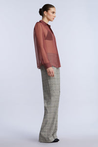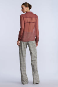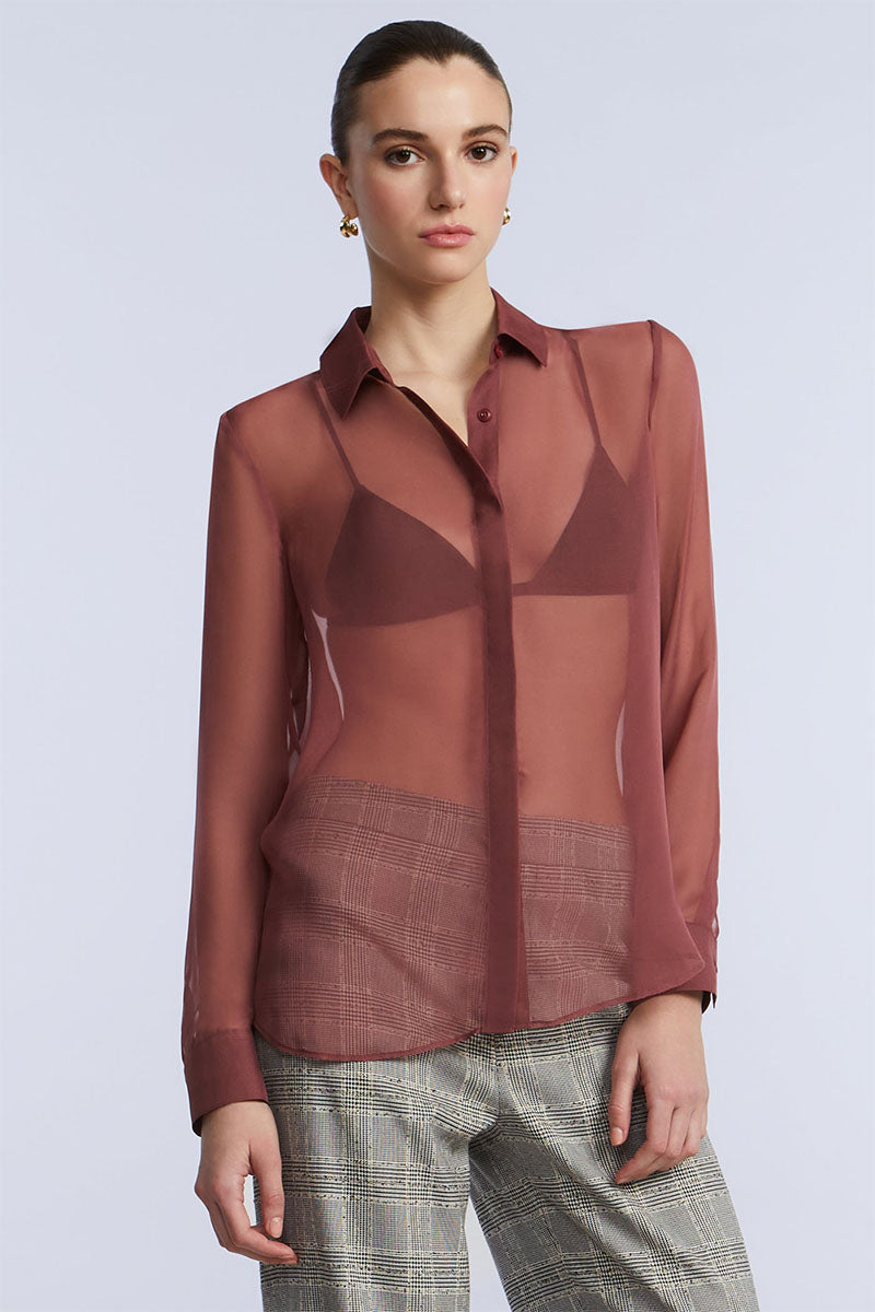 Sheer chiffon shirt with a pointed collar, hidden placket, and button cuffs. Tailored in a lightweight, fluid fit with gathered back yoke detailing. A bold, see-through staple that’s ready to layer or stand alone.