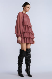 Tiered chiffon mini dress with ruffle detailing at the sleeves and neckline. Designed with voluminous long sleeves and a softly gathered silhouette that floats with movement. Perfect for date nights, rooftop drinks, or fall getaways.