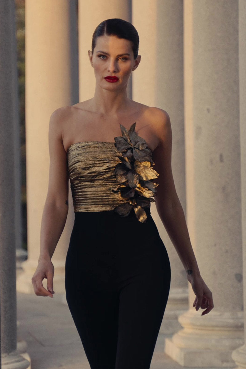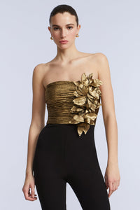 Metallic lamé strapless jumpsuit with a pleated bodice and sculpted floral appliqué. Designed with slim black legs for a sleek, elongated look. A concealed back zipper keeps the silhouette sharp—perfect for holiday parties.