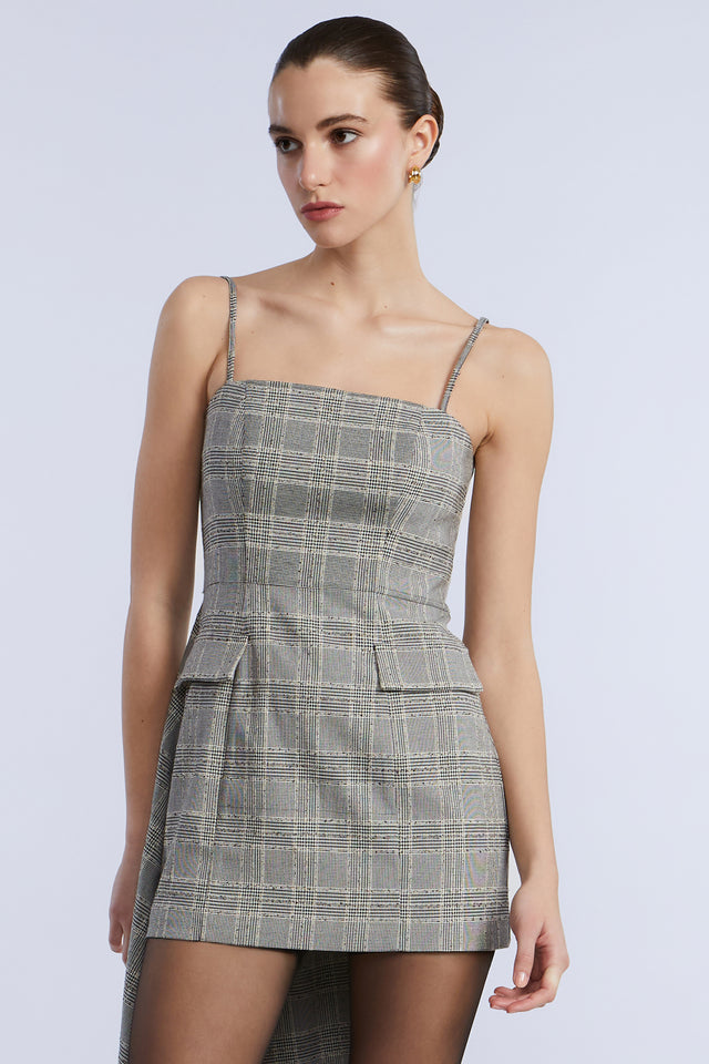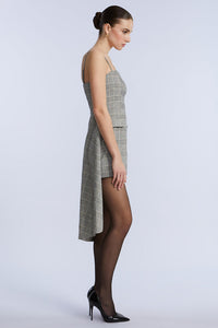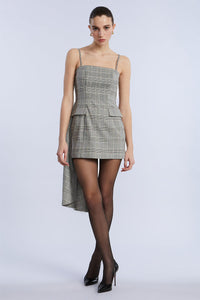 Tailored mini dress in a grey plaid suiting with asymmetric drape detail at the hem. Finished with flap pockets and a square neckline. Concealed back zipper closure.