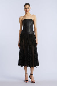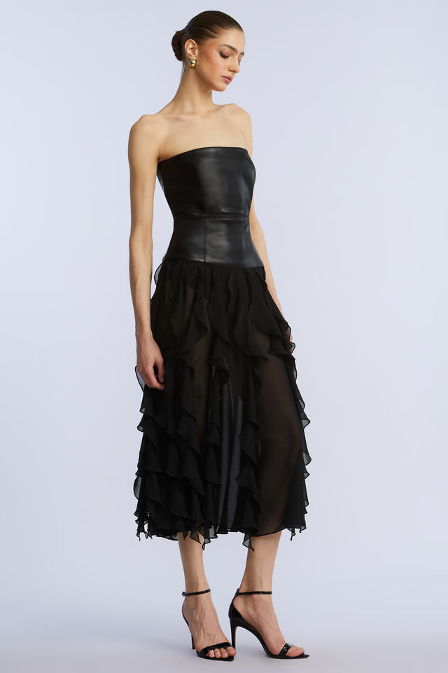Strapless faux leather dress with a sculpted bodice and soft chiffon skirt. Designed with cascading ruffle tiers for dynamic texture and semi-sheer movement. Finished with a concealed back zipper—made for dancing past midnight.
