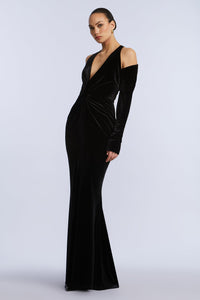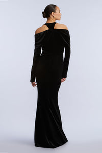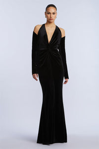 Velvet halter gown with an open shoulder detail and plunging neckline. Cut with a knotted front and long sleeves that drape off the arm, it hugs through the hips before flaring into a clean hem. A midnight knockout for galas, black-tie events, or winter formals.