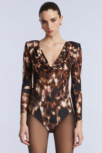 Sculpted bodysuit cut from glossy animal-print jersey with strong shoulders and a plunging draped neckline. Finished with snap closures at the base for a smooth, fuss-free fit. Style it solo or tucked into matching satin for the full effect.