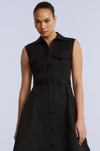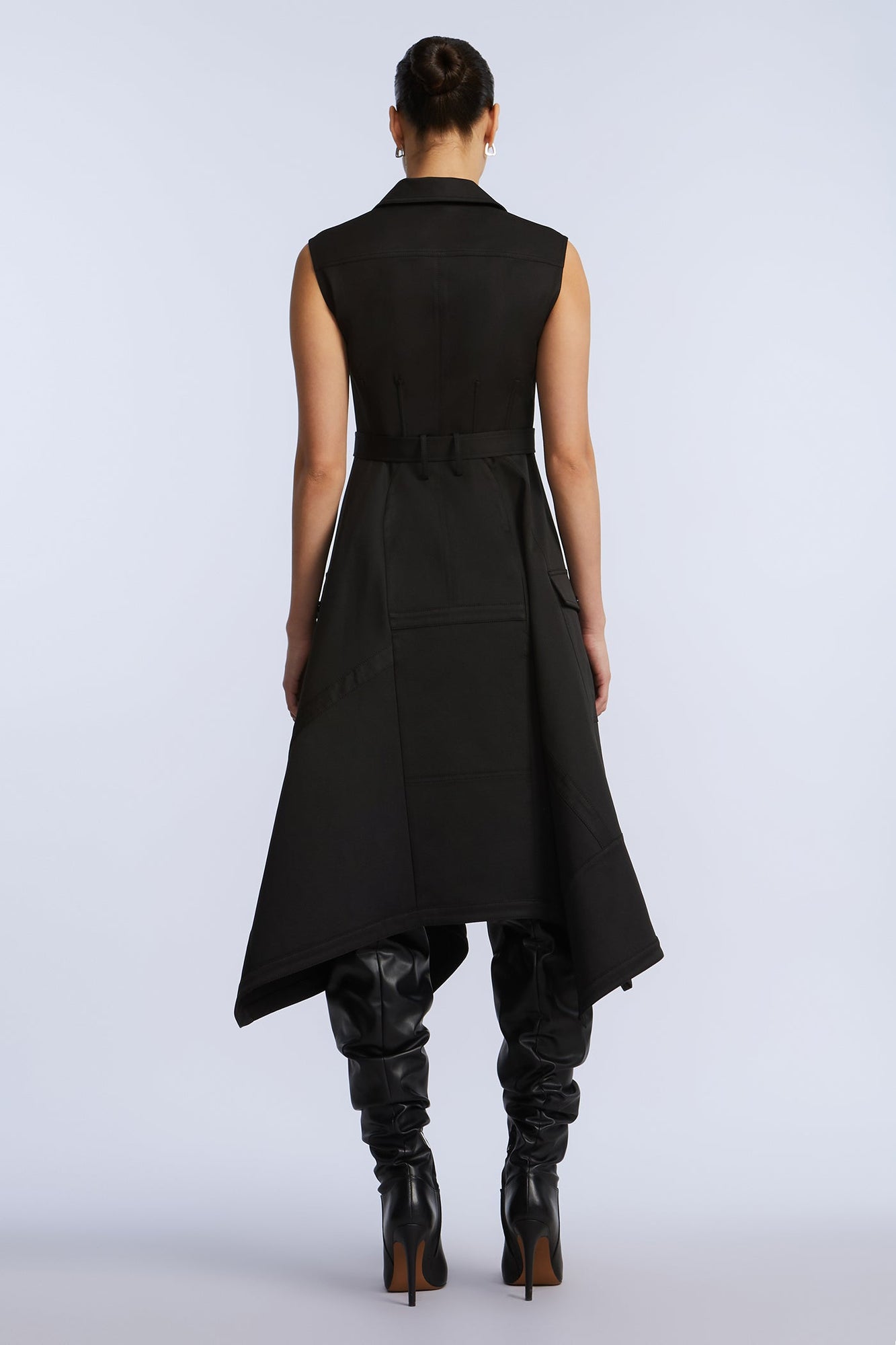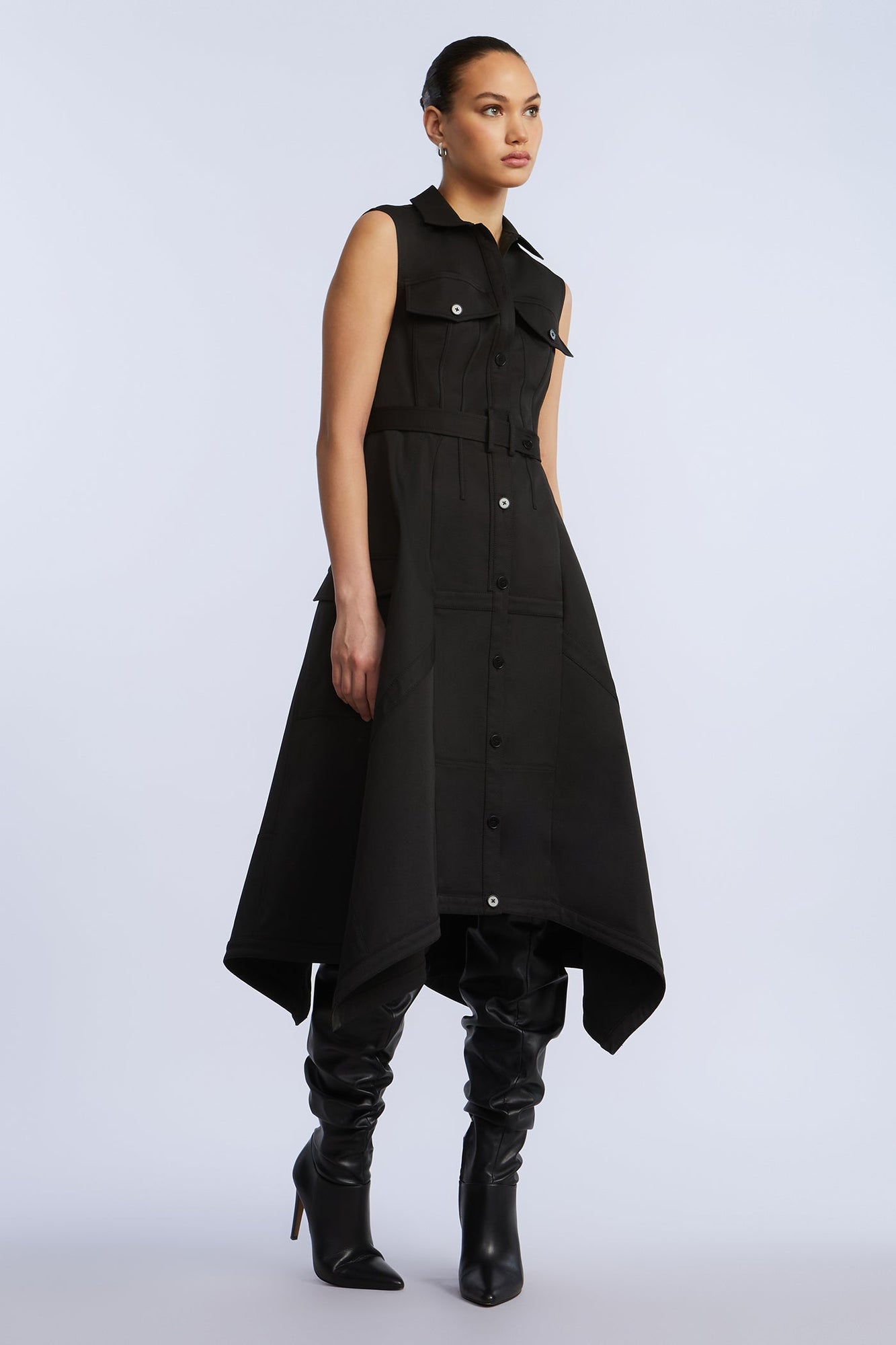 Sleeveless utility midi dress in structured stretch cotton twill. Designed with a pointed collar, angled flap pockets, and a belted waist, it features a full button front and sharp handkerchief hem. A cool, tailored pick for fashion week appointments or a downtown dinner.
