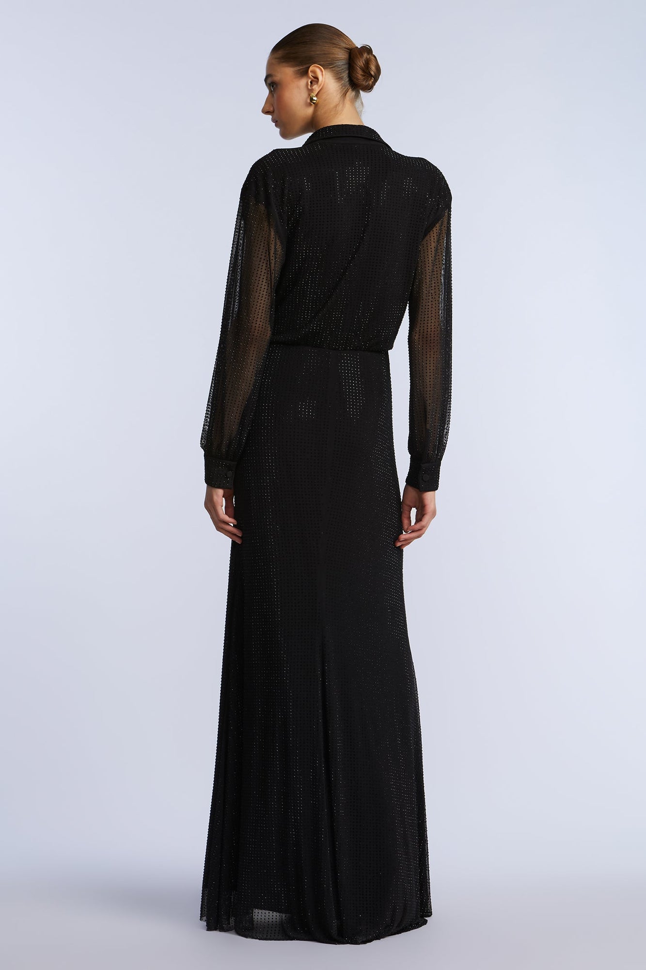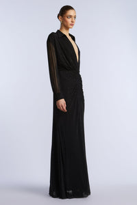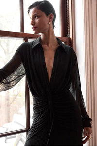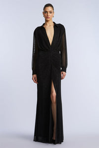 Metallic mesh gown with micro rhinestone embellishment and soft gathered pleating at the waist. Draped front and blouson bodice create effortless shape with subtle sparkle. Sleek enough for galas, relaxed enough for rooftop celebrations.