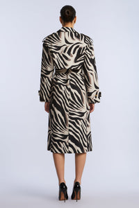 Statement trench coat in a tonal zebra print with epaulettes, a belted waist, and storm flap details. Finished with gold-toned hardware for a polished edge. Equal parts wild and refined—made for city strolls and fall layering.