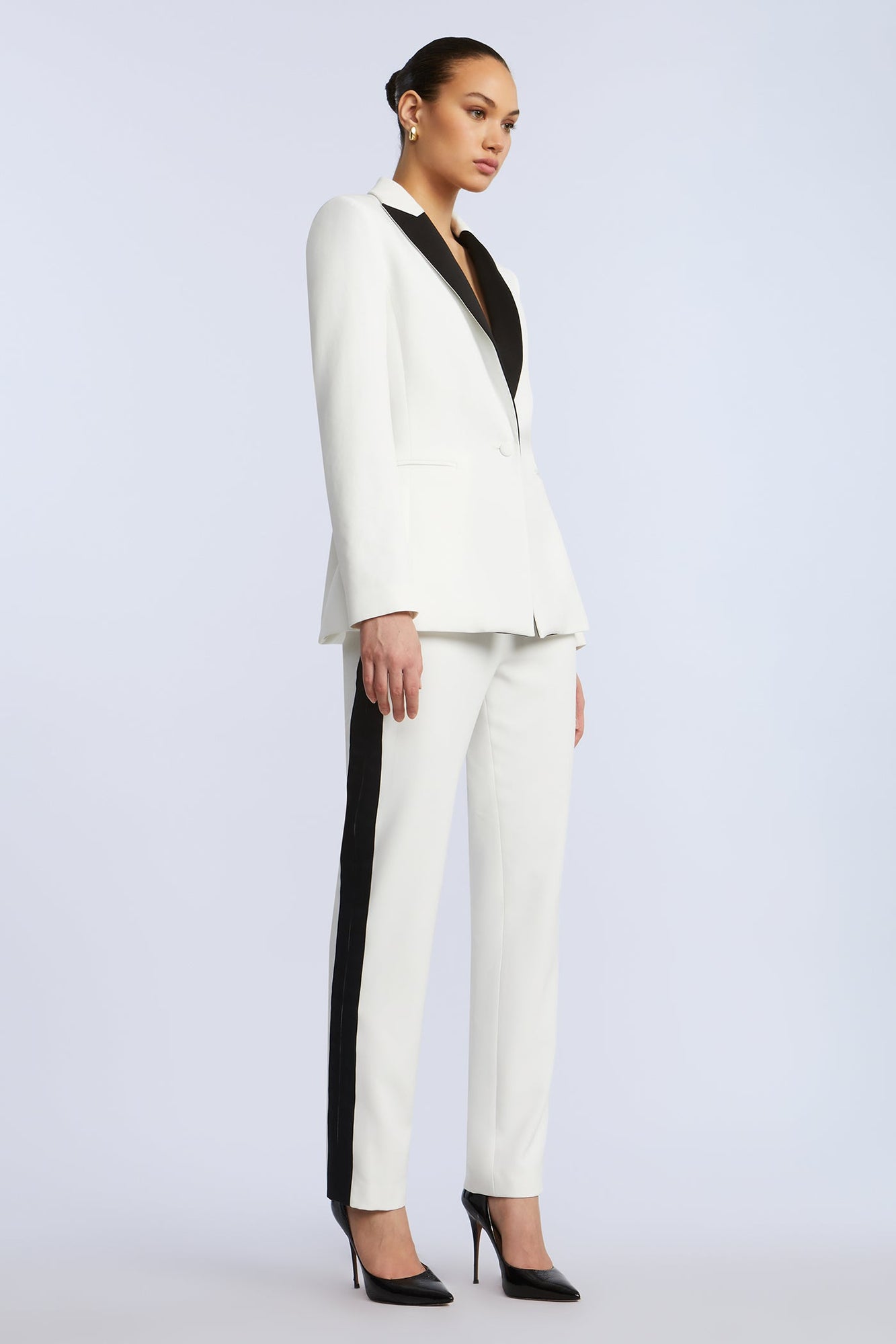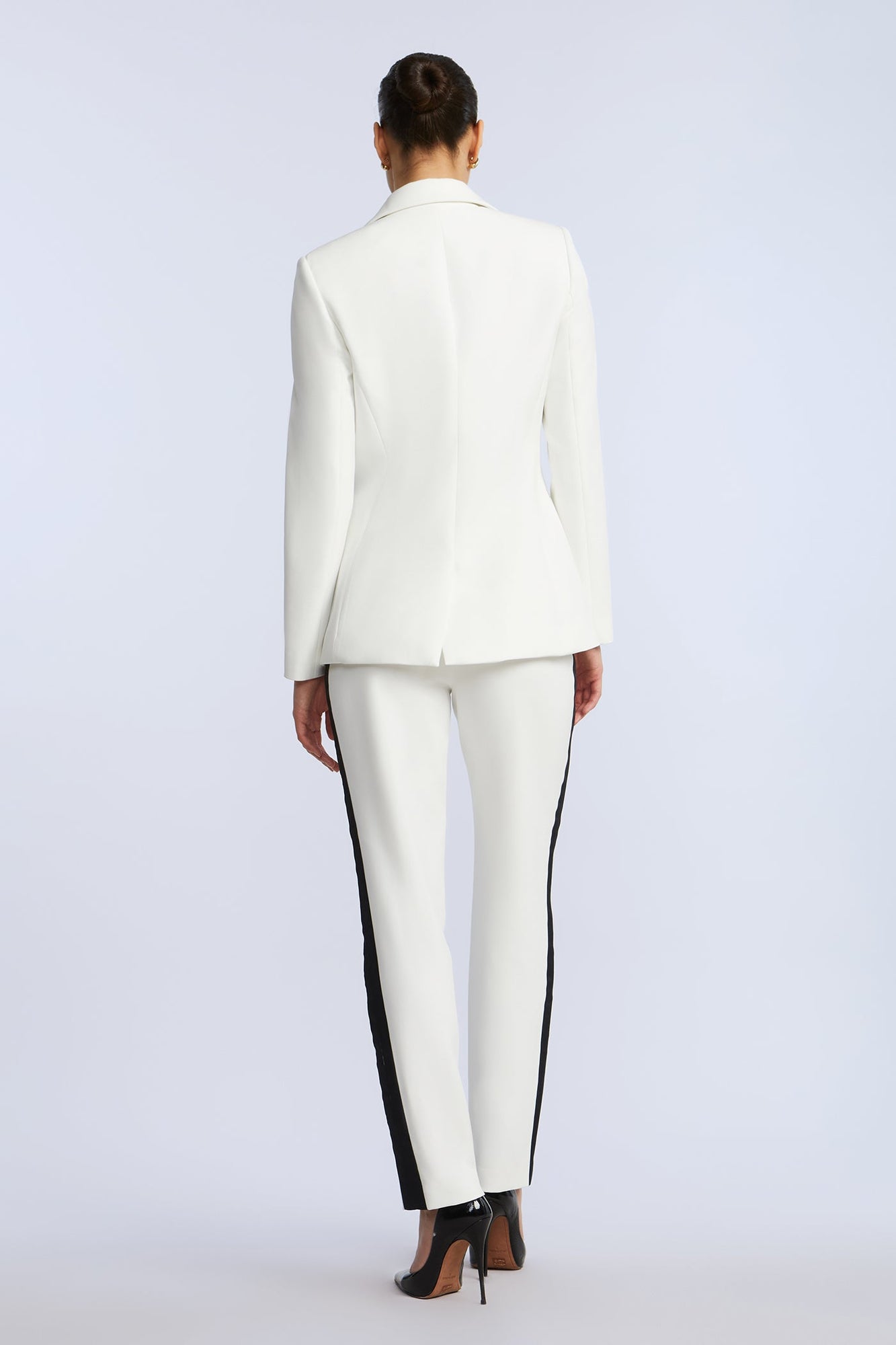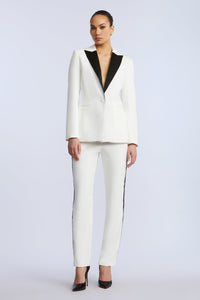 White suiting blazer with tonal satin lapels and a single button closure. Fully lined with soft shoulder structure and jet pockets. Sharp, clean, and designed to turn heads.