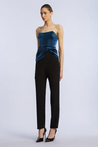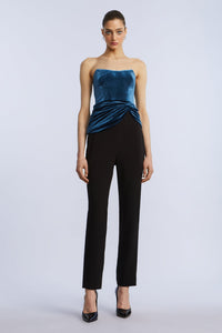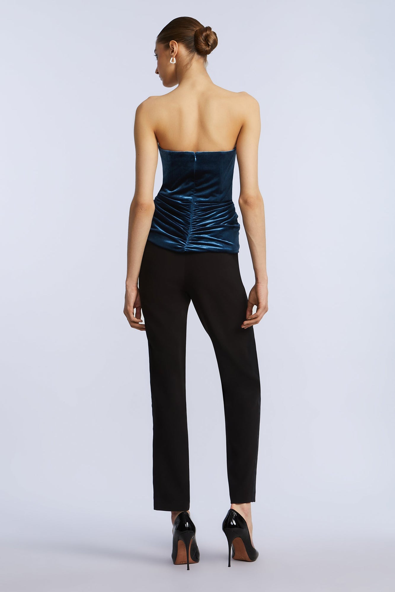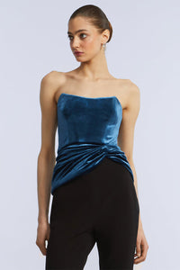 Velvet bustier with soft side gathers. Sculpted at the waist for a flattering silhouette with sleek structure and subtle shine. Ideal for winter weddings or dressy cocktail plans.
