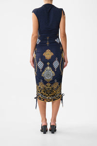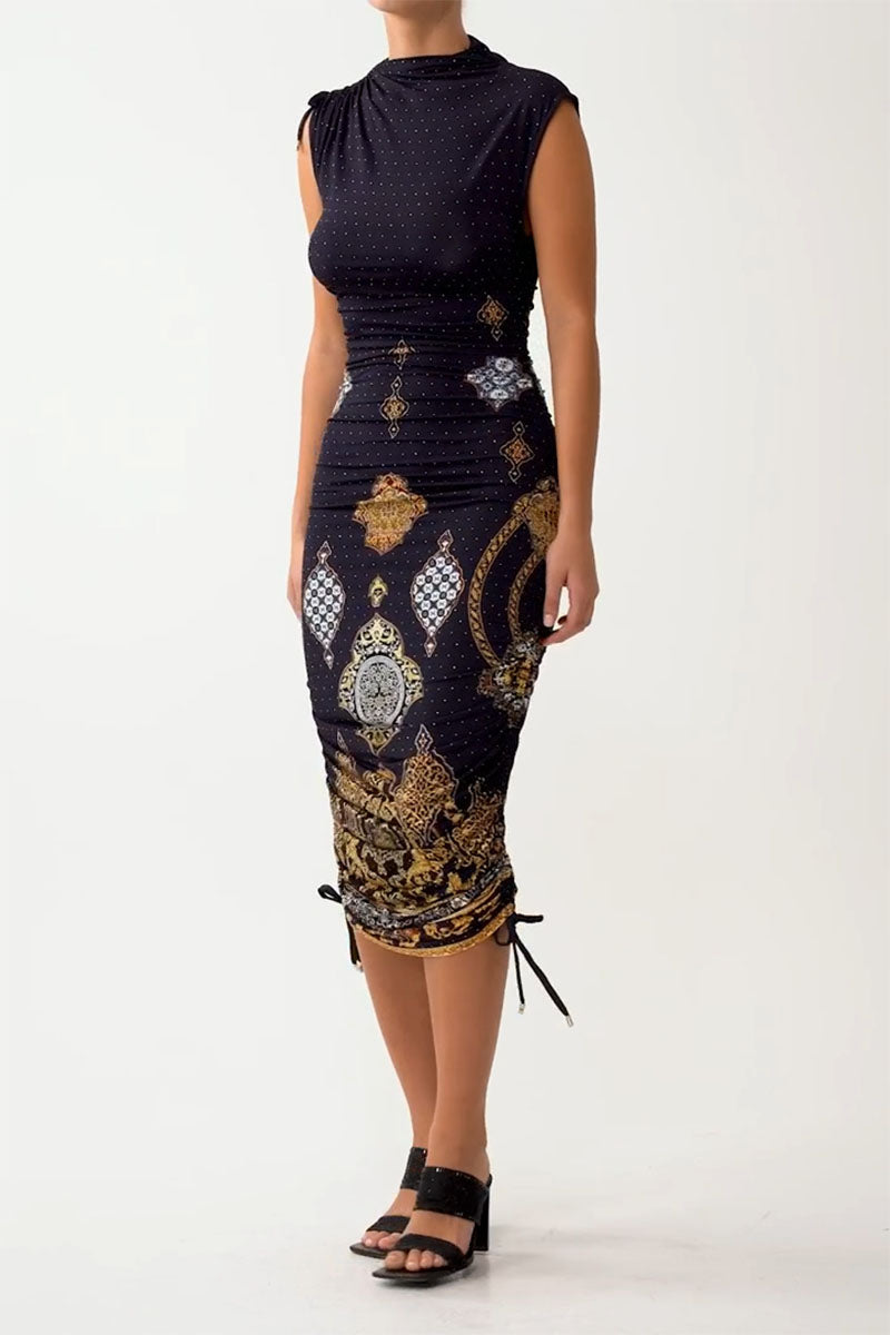 The The Imperial Gate Asymmetric Ruched Jersey Dress is a handcrafted silhouette designed by our in house artisans. Reimagined in an exclusive limited edition print, our ruched jersey dress sculpts the form with a sleeveless, figure hugging shape and all over ruching. Adjustable side ties invite you to play with asymmetry and discover your desired hemline.
