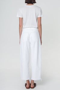 Adeline cropped barrel jean features a unique detail where the front pleats are folded, slightly covering the upper part of the slanted pocket. The waist features two button options for adjusting the size, and the leg portion has a slightly loose fit.