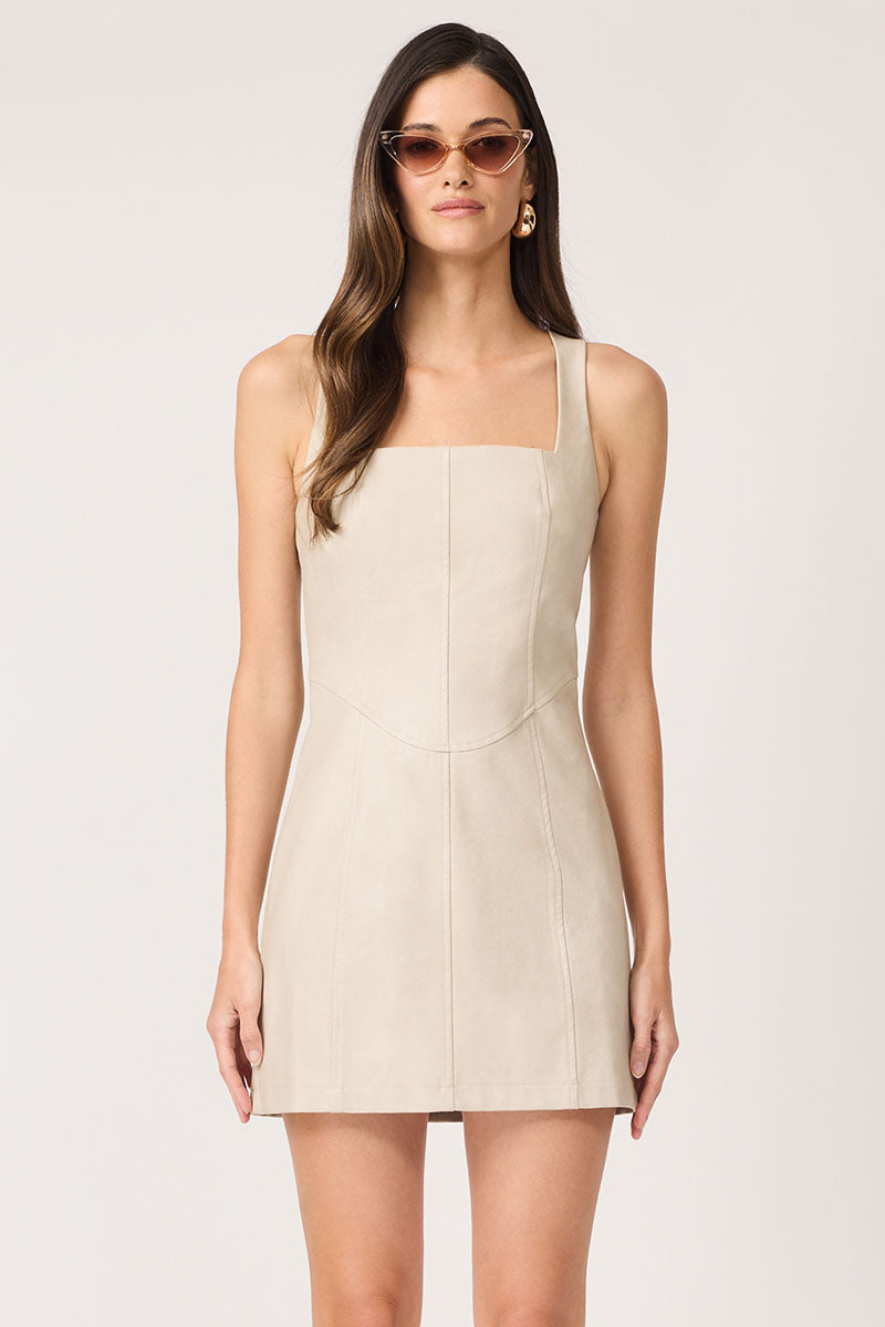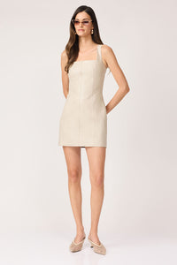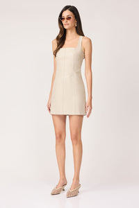 Elevate your style with the CELINA LEATHER MINI DRESS, designed for a confident, modern look. Featuring a sleek square neckline and sleeveless cut, this slim-fit woven dress highlights your silhouette with an edgy exposed zipper detail. Perfect for making a bold statement at any event, its refined structure combines comfort with contemporary allure.