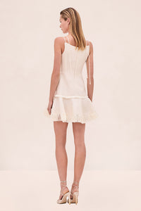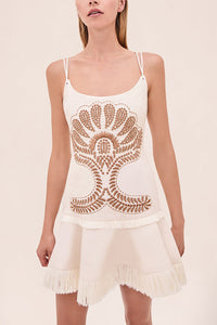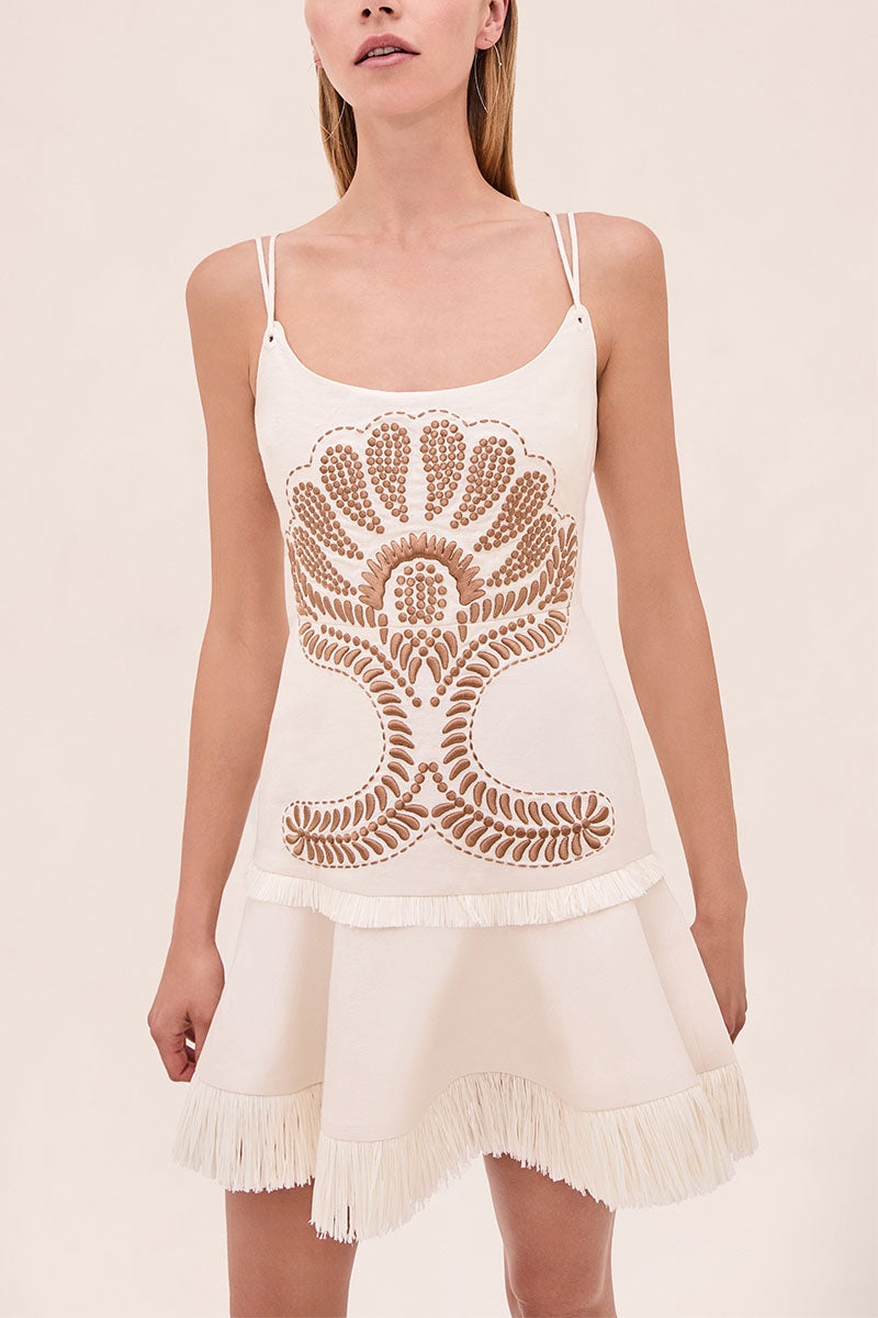 The Kikie Dress is an embroidered mini dress featuring intricate floral detailing with raffia trim at the hem.