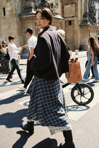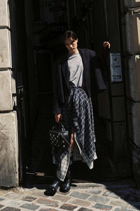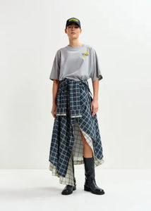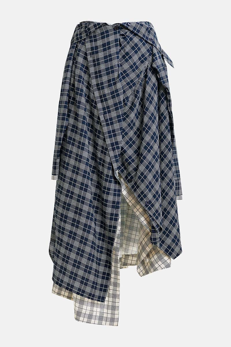 Cut from a check print fabric, this skirt is playfully deconstructed for a directional edge. Designed for a relaxed fit, it features a fluid, asymmetrical hem. The defining detail are the shirt sleeves artfully wrapped and buttoned around the waist—creating the illusion of a shirt nonchalantly tied at the hips. Style it with a crisp white blouse or a fitted tank.