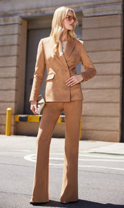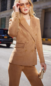 Crafted in luxurious vegan suede, this blazer blends a classic double-breasted silhouette and strong shoulders with a modern boyfriend fit. The quintessential fall blazer is elegant, structured, and beautifully tailored.