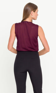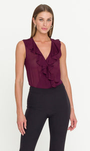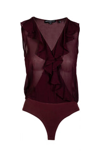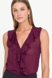 Add a touch of romance to your wardrobe with the Caydence Georgette Bodysuit. Designed in flowy vegan silk georgette, this faux-wrap silhouette features a cascade ruffle neckline and a snap-closure bottom for ease. The deep Malbec hue adds a bold, wine-toned richness—perfect for pairing with tweed, leather, or denim.