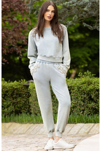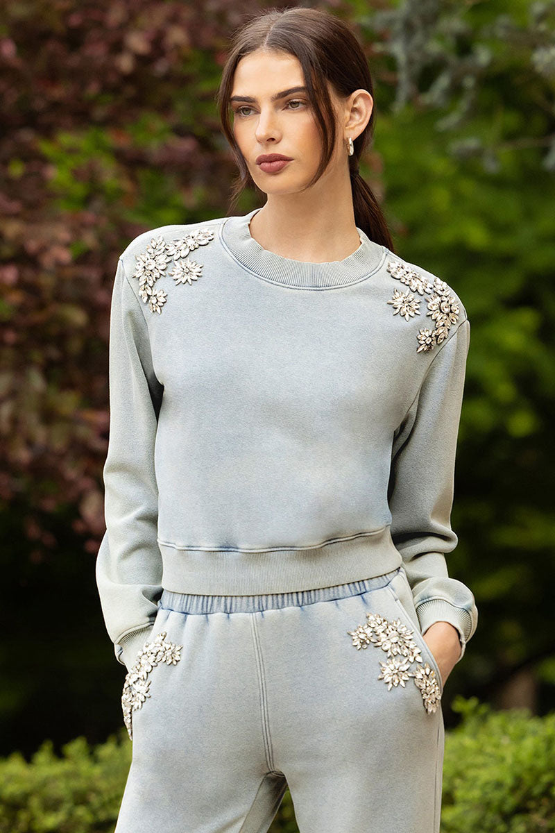 A shimmering crystal accent at the shoulder adds refined sparkle to this classic lightly distressed French terry sweatshirt. Worn with the matching sweatpants, it creates a coordinated look that balances comfort and style.