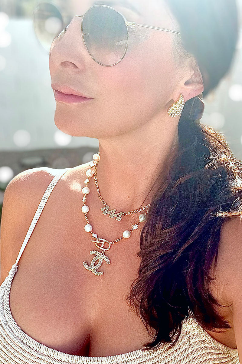 CC pearl charm on 18" large pearl and white clover chain with cz toggle closure in the front.