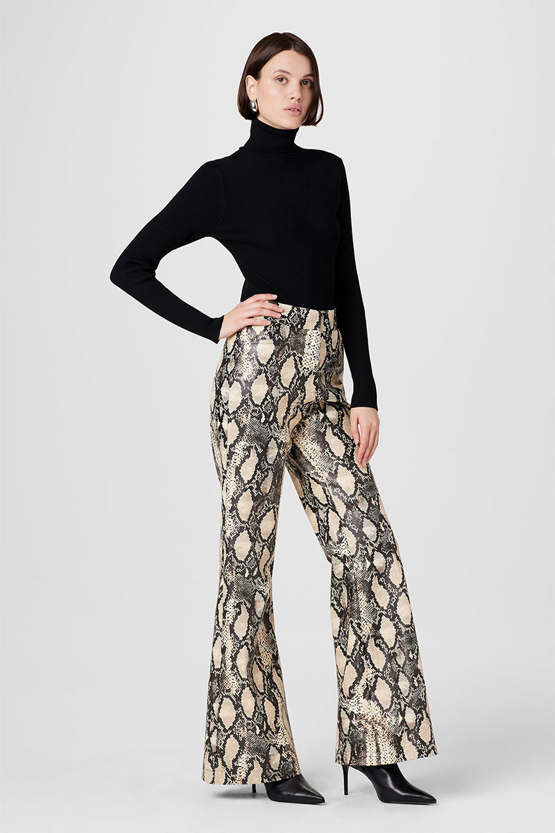 The Gia Pants bring bold energy in a python-printed vegan leather. Designed with a flattering high waist and wide-leg silhouette for statement-making polish.