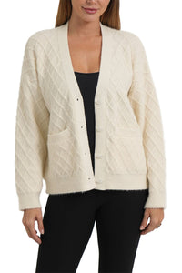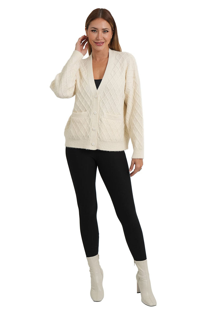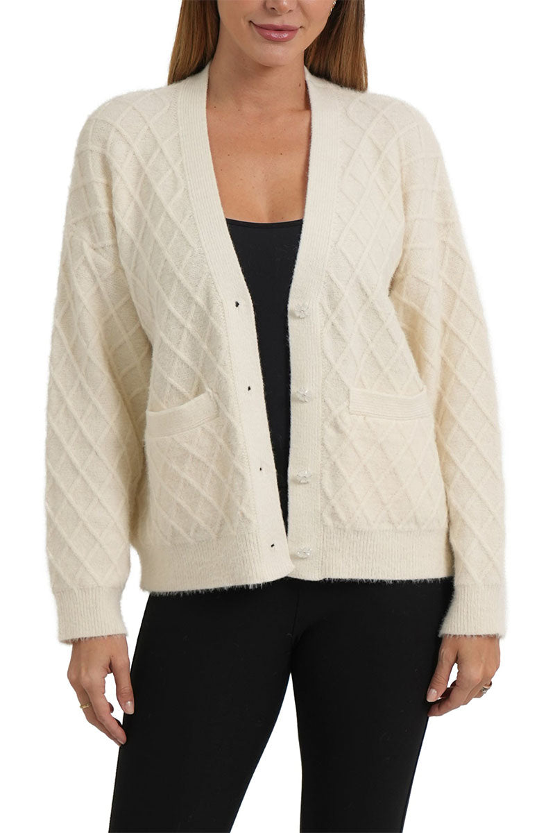 Dolly diamond stitch cardigan, front button down closure, front patch pockets, embroidery trim, relaxed fit.