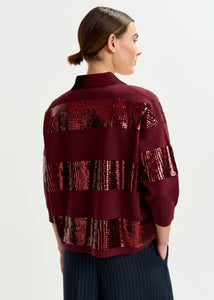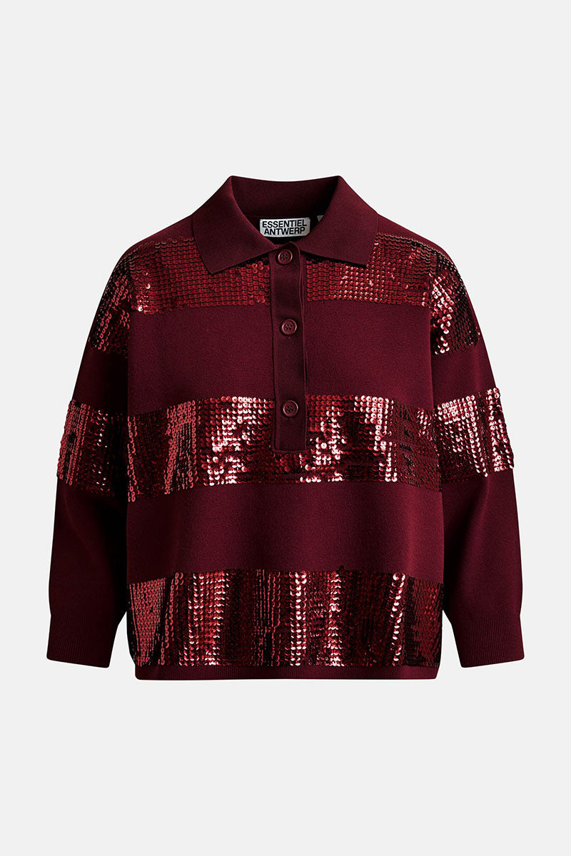 Fine-knit polo blends sporty structure with statement sparkle. Designed for a relaxed fit, it features sequin-embellished stripes across the body and sleeves, contrasted by a bold collar and placket. Dropped shoulders, 3/4 sleeves, and a subtly curved hemline add ease to the silhouette, while ribbed trims provide a clean finish.