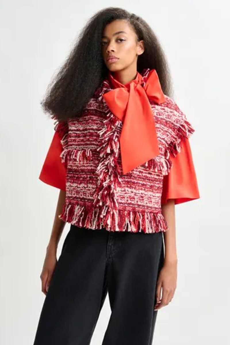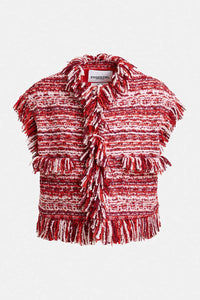 Cut from a textured wool-blend bouclé, this sleeveless jacket is cropped to sit just above the waist. It’s designed for a close fit with a structured, boxy shape. The tactile fabric is enhanced by soft fringe detailing along the collar, placket, hem, and patch pockets—adding movement and a hint of playful texture. Fully lined for comfort, it fastens with discreet hook-and-eye closures. Layer it over a crisp shirt or wear it solo for a fresh take on tailoring.
