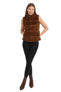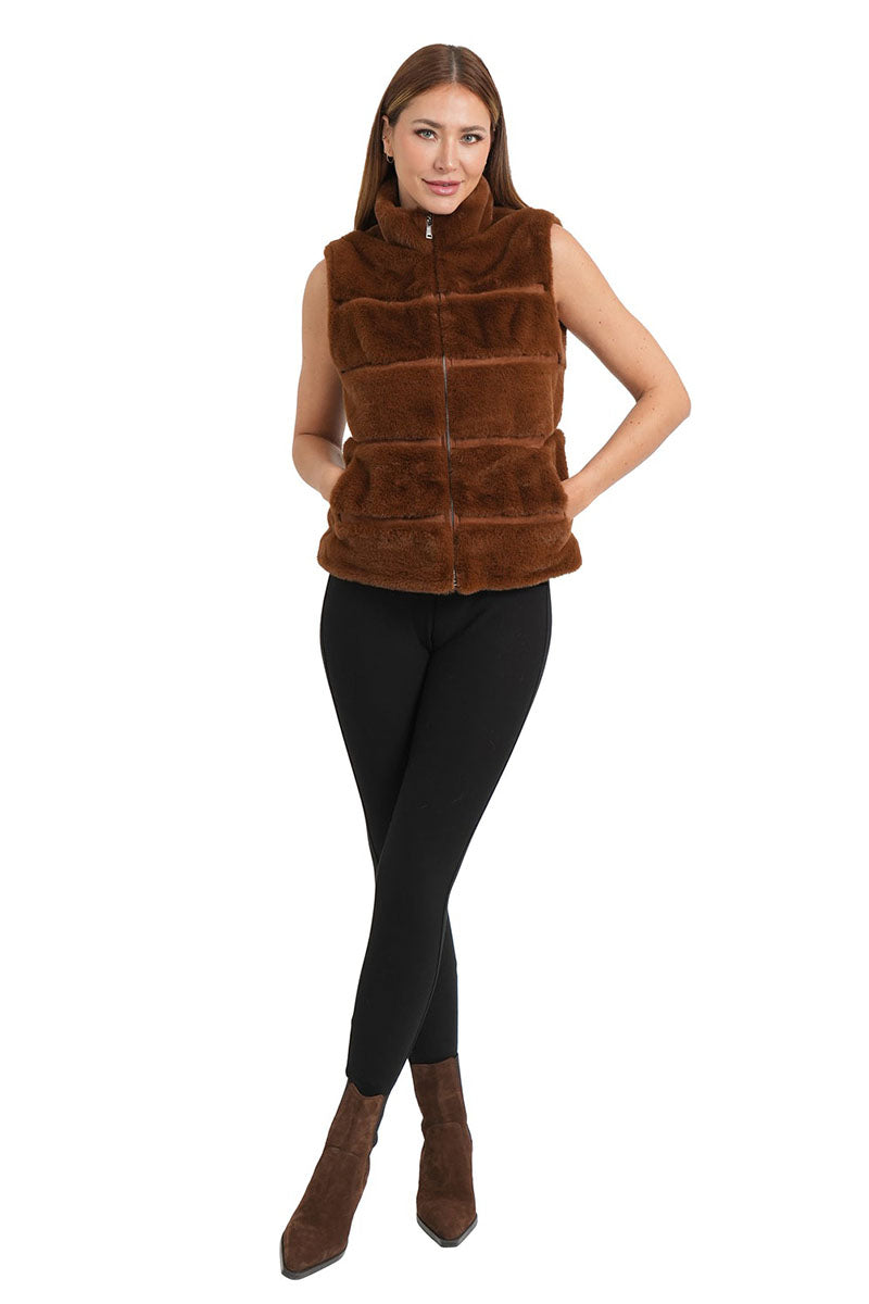 Vince faux fur vest, stand collar, zip front closure, slit pockets on front, hem lands at hip, relaxed fit.