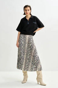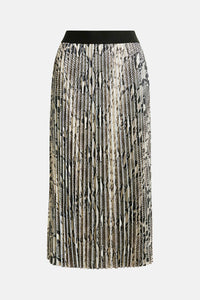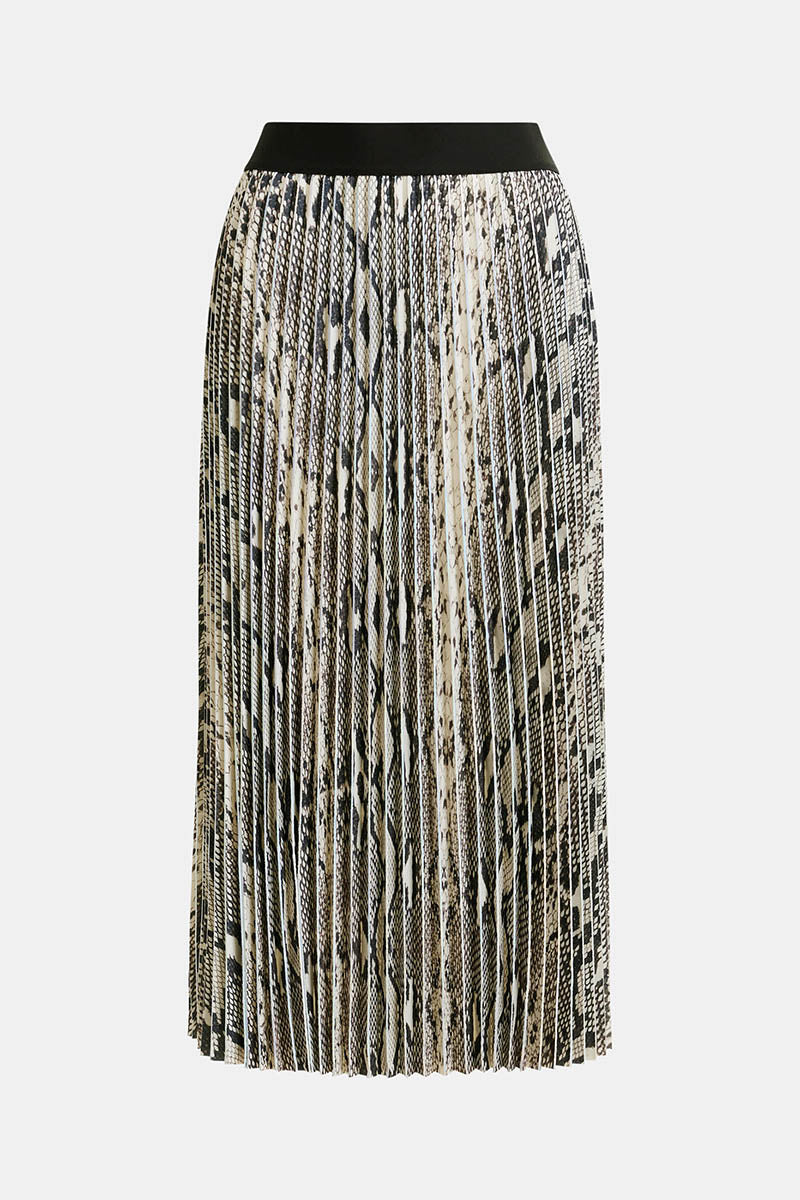 Pressed with sharp accordion pleats for movement and texture, this midi-length skirt is adorned with a snake print. It features a fitted high-rise, elasticated waistband and is finished with raw hemline edges