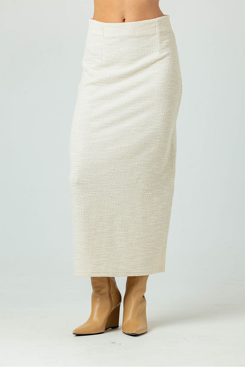 Crafted from lightweight, softly washed knit bouclé, this skirt brings dimension to a classic silhouette. Updated from the traditional pencil skirt, it’s slim through the waist and hips and finishes just above the ankles on most wearers. A subtle back slit adds a modern edge, while an invisible zipper ensures a seamless finish.