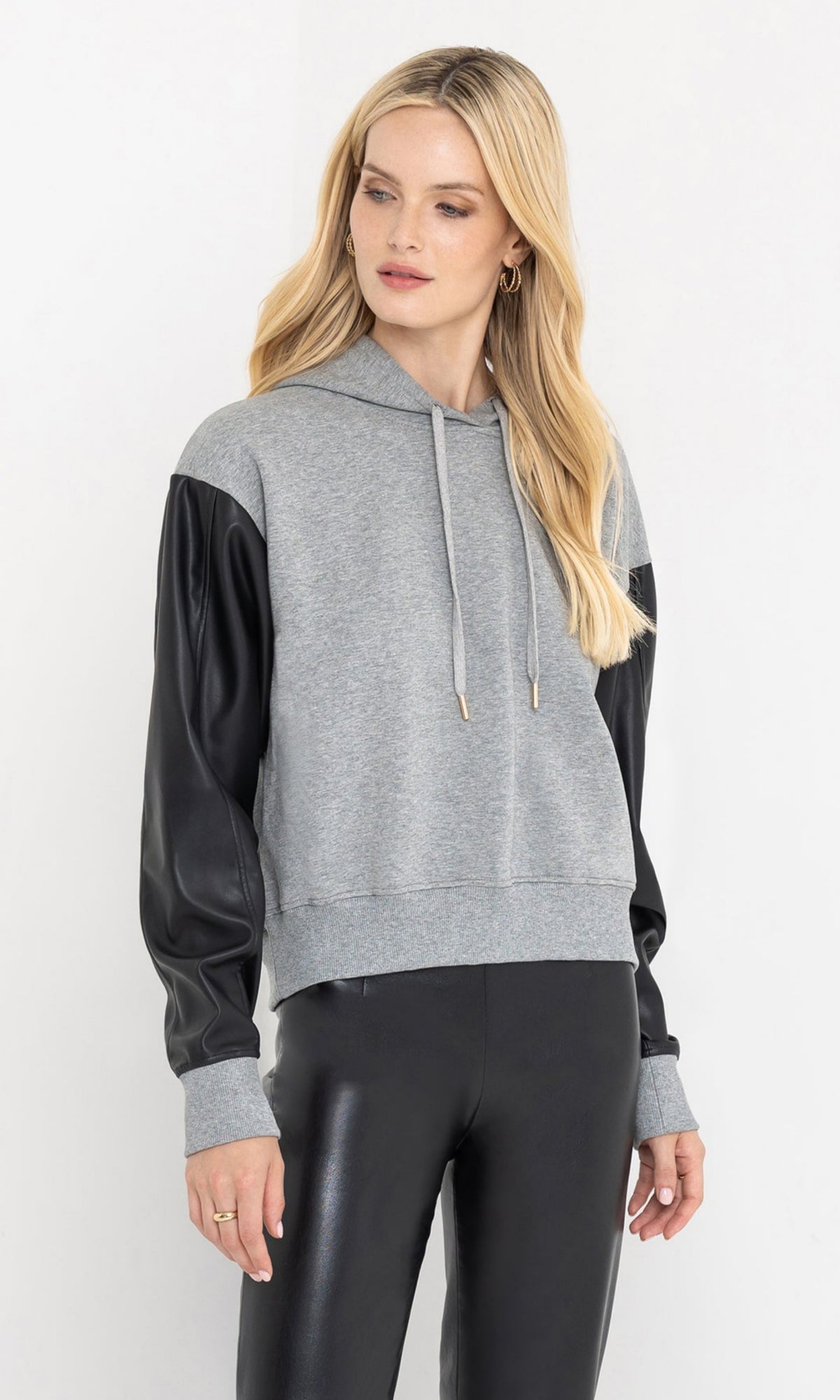 The Lisbet Hoodie brings an elevated twist to off-duty style. Made from soft, brushed-back French terry with contrast vegan leather sleeves, this slightly cropped silhouette delivers a perfect mix of streetwear and sophistication. The relaxed fit and drawstring hood keep it laid-back, while the sleek faux leather arms add a touch of downtown cool. Pair it with denim, joggers, or vegan leather bottoms for the full effect.