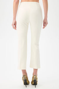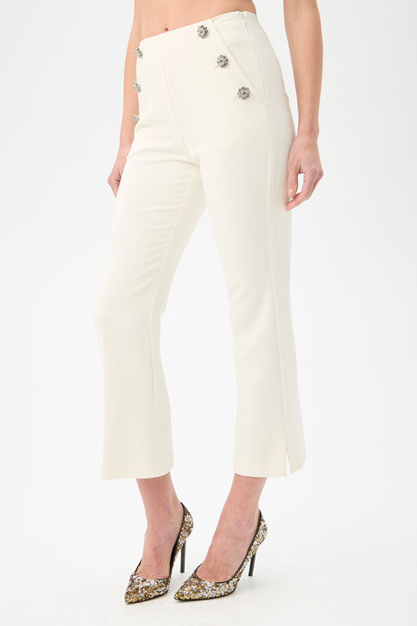 A modern update to your basic black pants, this ladylike cropped pant has a flattering flared fit. It features front pleats, a side seam invisible zip, and decorative buttons. This sleek pant is made of smooth compact weave stretch suiting for a breezy finish.
