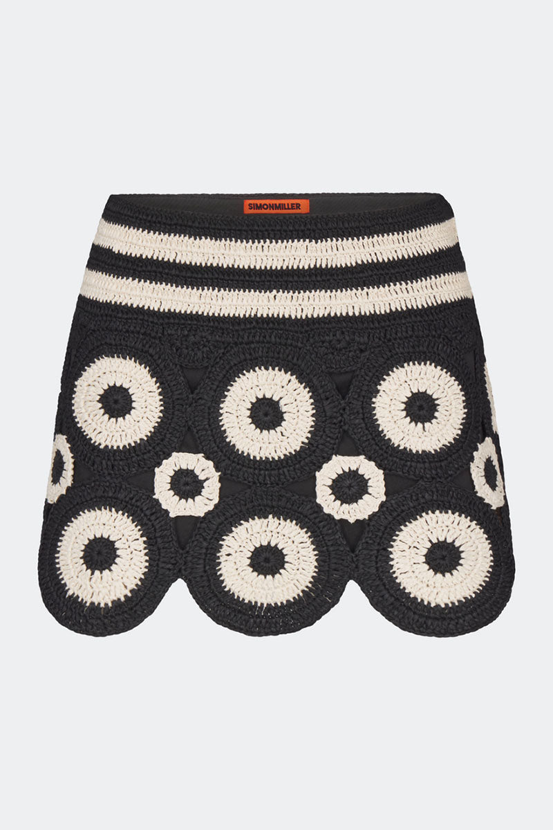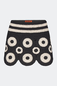 Low-rise hand-knit crochet mini skirt in soft neutral hues, designed for a fitted silhouette. Finished with a self-colored lining for comfortable, seamless wear.