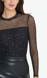 Daring yet refined, the Brody Crystal Bodysuit is designed to sparkle. Crafted in sheer black mesh, this fitted silhouette is embellished with allover clear crystals for a high-shine finish. With long sleeves and a mesh neckline, it’s the perfect statement layer to wear with denim for downtown edge or tucked into tailored trousers for evening allure.