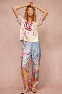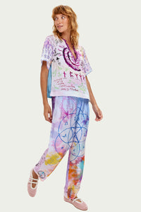 Soft lilac and turquoise tie-dye creates a relaxed V-neck silhouette, while sacred geometry and protection runes celebrate spiritual connection throughout.