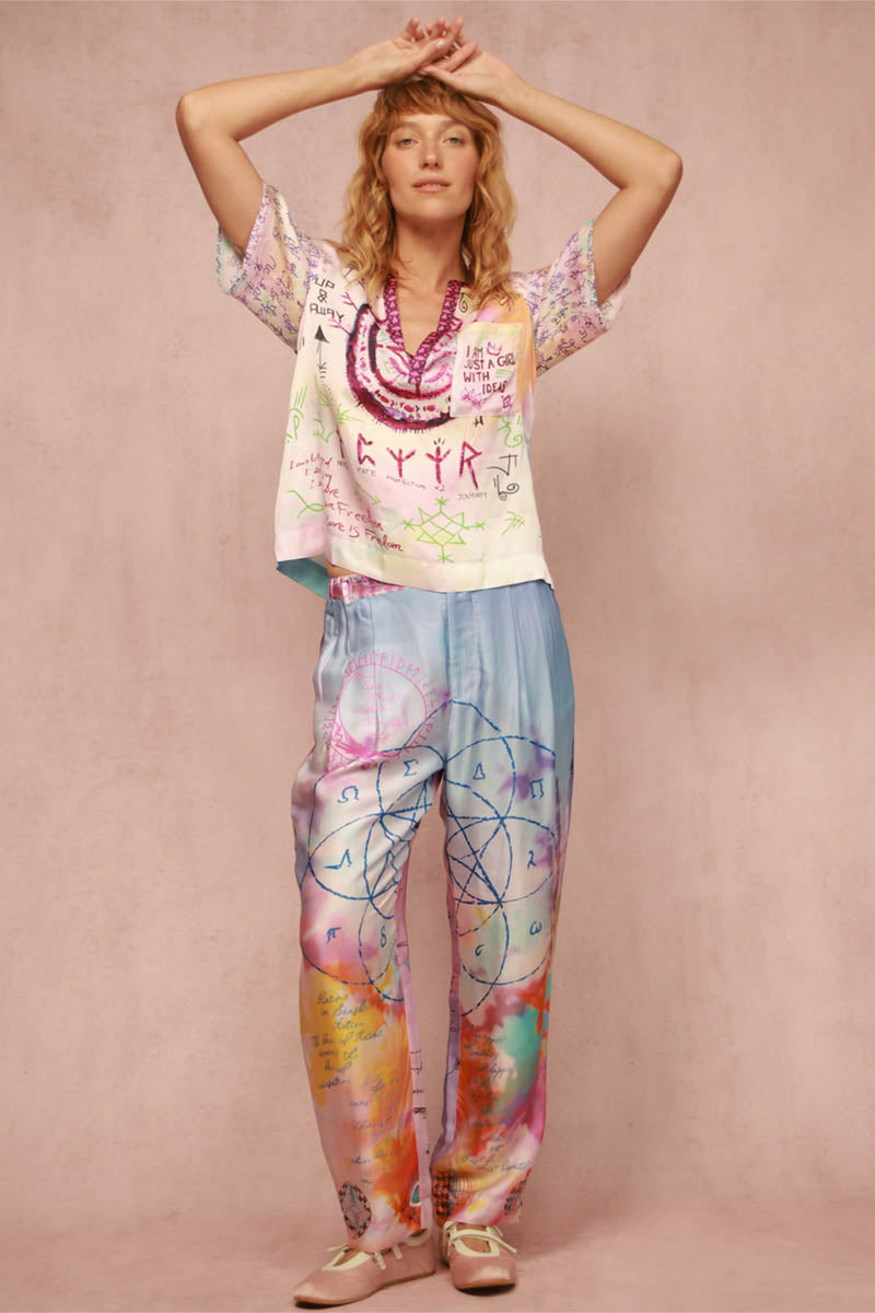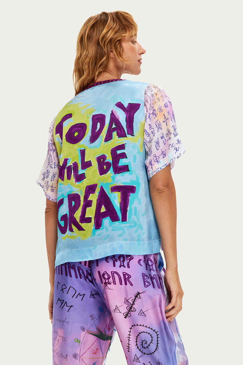 Embrace your journey with the Charlie placket shirt featuring bold "TODAY WILL BE GREAT" typography and mystical runic scripts. An intricate purple mandala adorns the front alongside empowering messages like "I AM JUST A GIRL WITH IDEAS" and "LOVE IS FREEDOM."