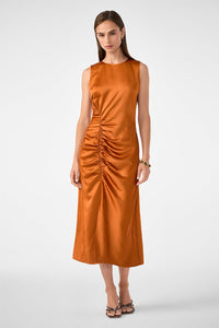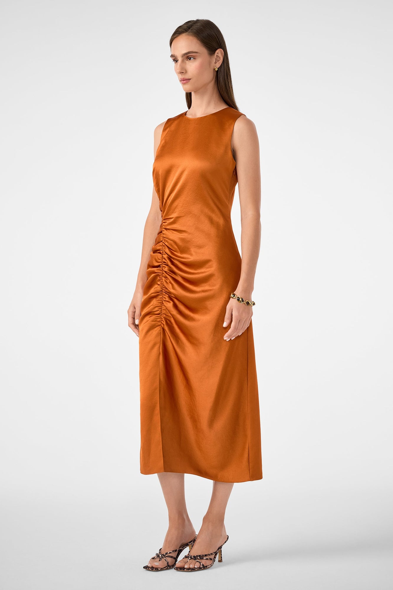 This fitted satin dress features a bold fall hue that will stand out at every elevated event this season. Its slim silhouette and shirring accent give this cocktail dress a flattering fit. This sleeveless dress features a midi length, crewneck, and side slit. It is made of lightweight, drapey satin with a beautiful sheen, making it a year-round essential dress.