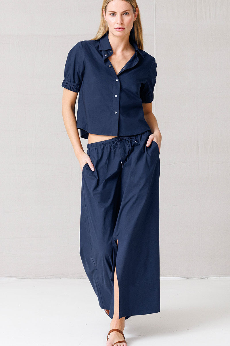 Like any respectable fashion girlie, we love a classic camp shirt, but we are also obsessed with putting playful spins on traditional styling. Here we have cropped the length and added a ruching detail to finish the sleeve. Polished gunmetal hardware gives the camp an added modern cool-girl upgrade.