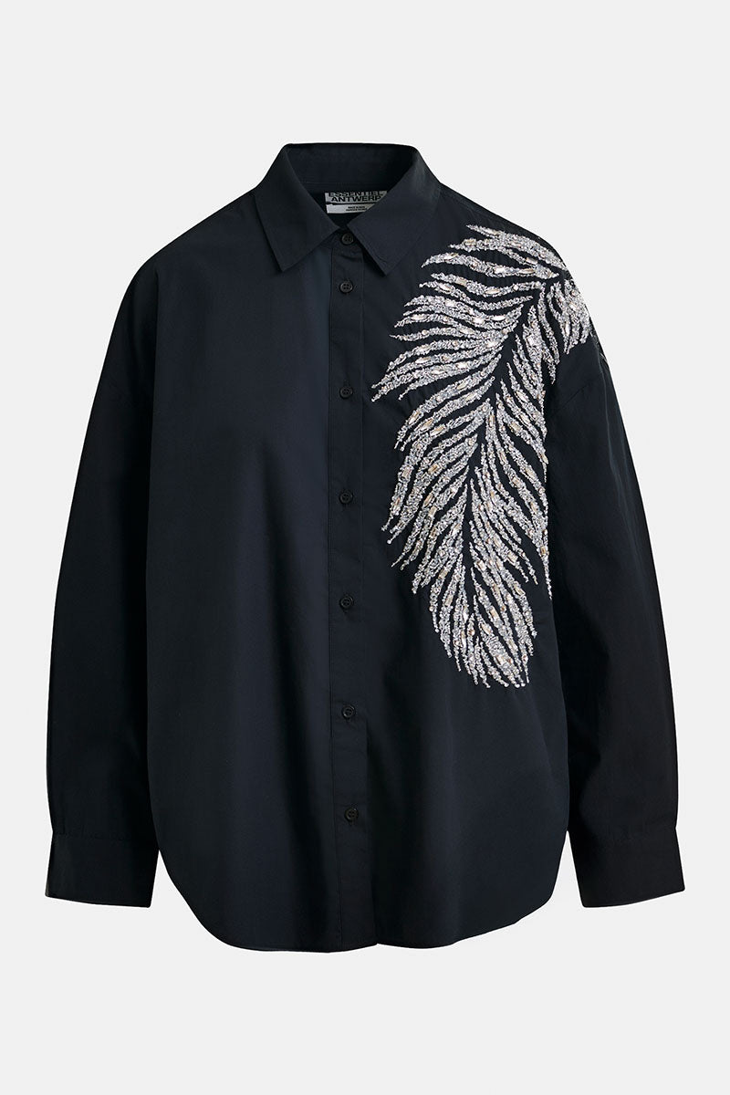 Crafted from 100% cotton, this shirt is cut for an oversized silhouette with dropped shoulders and a curved hem that falls longer at the back. It features a full button fastening and classic pointed collar. A sweeping feather motif, embroidered with sequins, rhinestones and beads, adds dimensional detail across the chest and shoulder.