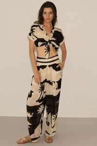 Introducing the Kha Pants—a refined take on resort wear featuring an elegant black and sand palm motif inspired by Marrakesh's timeless aesthetic. Constructed from sumptuous viscose with delicate lurex accents, these pants seamlessly blend comfort with understated luxury. The relaxed open-leg cut provides a polished silhouette that transitions effortlessly from day to evening, offering the perfect finishing touch to any discerning wardrobe.