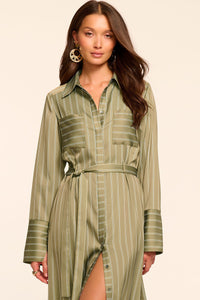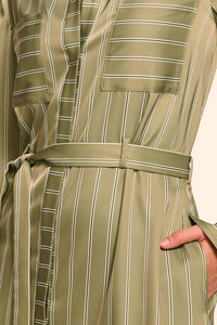 Safari dreams. The Miriam gives easy shirt dress energy that's anything but basic with its subtle stripes, classic collar, and removable self-tie belt. The relaxed fit with front pockets makes this perfect for travel days, beach walks, resort mornings, or anytime comfort meets polish.