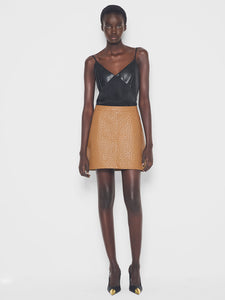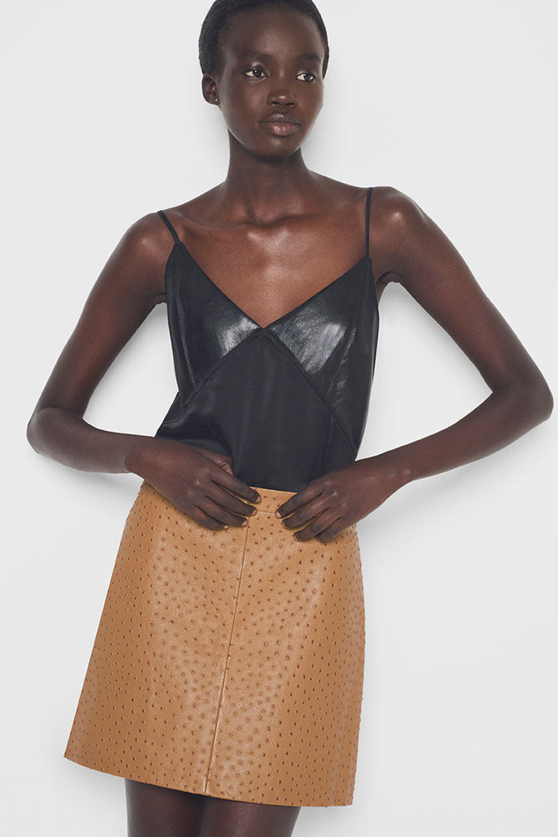 Nadine Mini Leather Upcycled Skirt is crafted from an eclectic inspired ostrich skin pattern and printed on buttery lambskin. Hitting just at mid-thigh, this skirt is perfect for your next night out. Pair with our matching Leather Blazer for a full look. This piece fits true to size, please order your normal size. If you are in-between sizes, we suggest sizing down for a more fitted look, or sizing up for added comfort.
