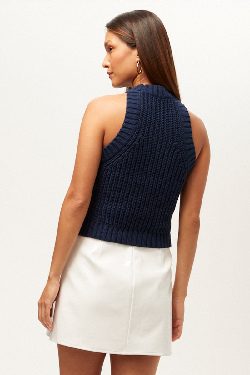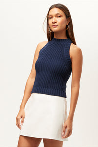 This elevated knit sleeveless sweater showcases a high neckline and ribbed knit texture for effortless versatility and timeless style.