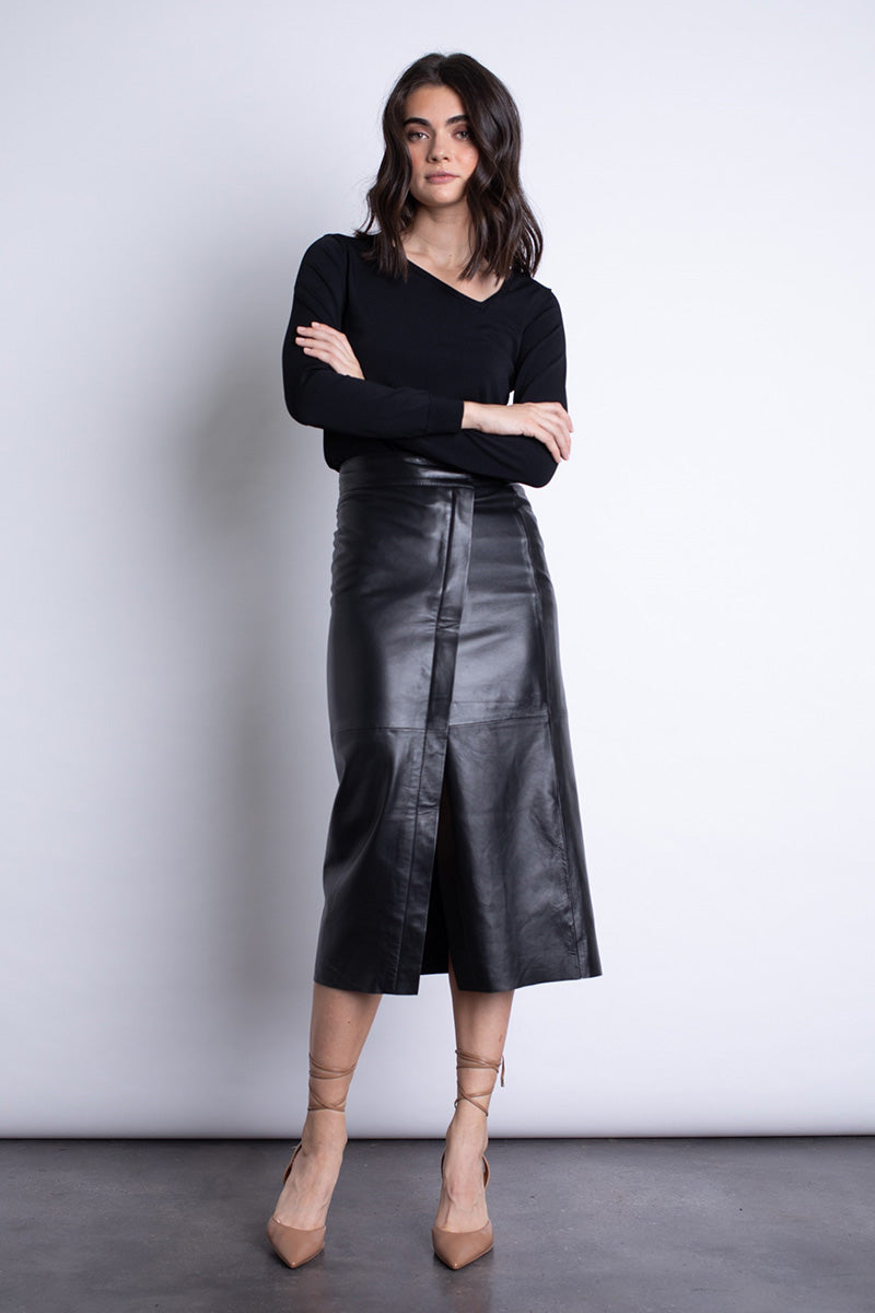 Get ready to wrap yourself in style with the Romina Skirt! Made of high-quality leather, this midi skirt has a unique wrap style that will make you stand out from the crowd. Perfect for adding a touch of edginess to your wardrobe.