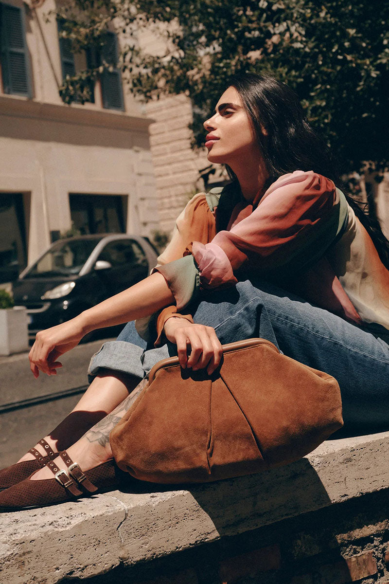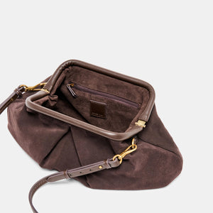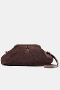 SAHARA is the ultimate fall clutch for every event on your calendar. Luxe suede in cognac or espresso, a slightly pleated design, and a frame closure complete this spacious bag. Utilize the detachable crossbody strap for a hands-free option and head out to the party.