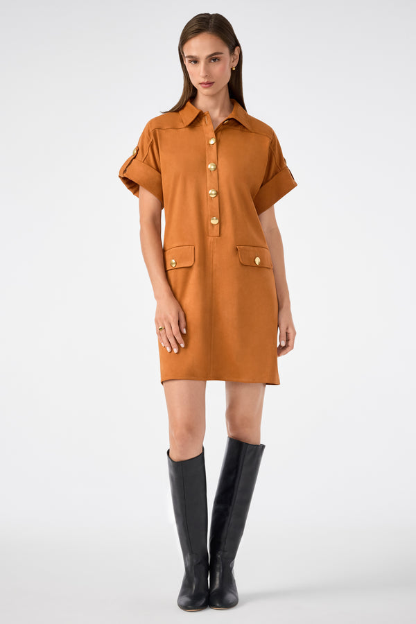 Add a utilitarian vibe to your wardrobe with this faux suede mini dress. Featuring short sleeves, a collar, a half button placket, tabs at the shoulder, and front flap pockets, this dress effortlessly goes from desk to dinner. It is made of soft, stretchy faux suede for just the right touch of luxe.