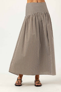 New this season: the lurex stripe features a monochromatic design accented with a subtle gold lurex detail. An update to the classic maxi skirt with an elongated, slimming asymmetric waistband. Soft gathers at the waistband create an elegant drape and a full fit through the body. Finishes just at the ankle on most wearers.