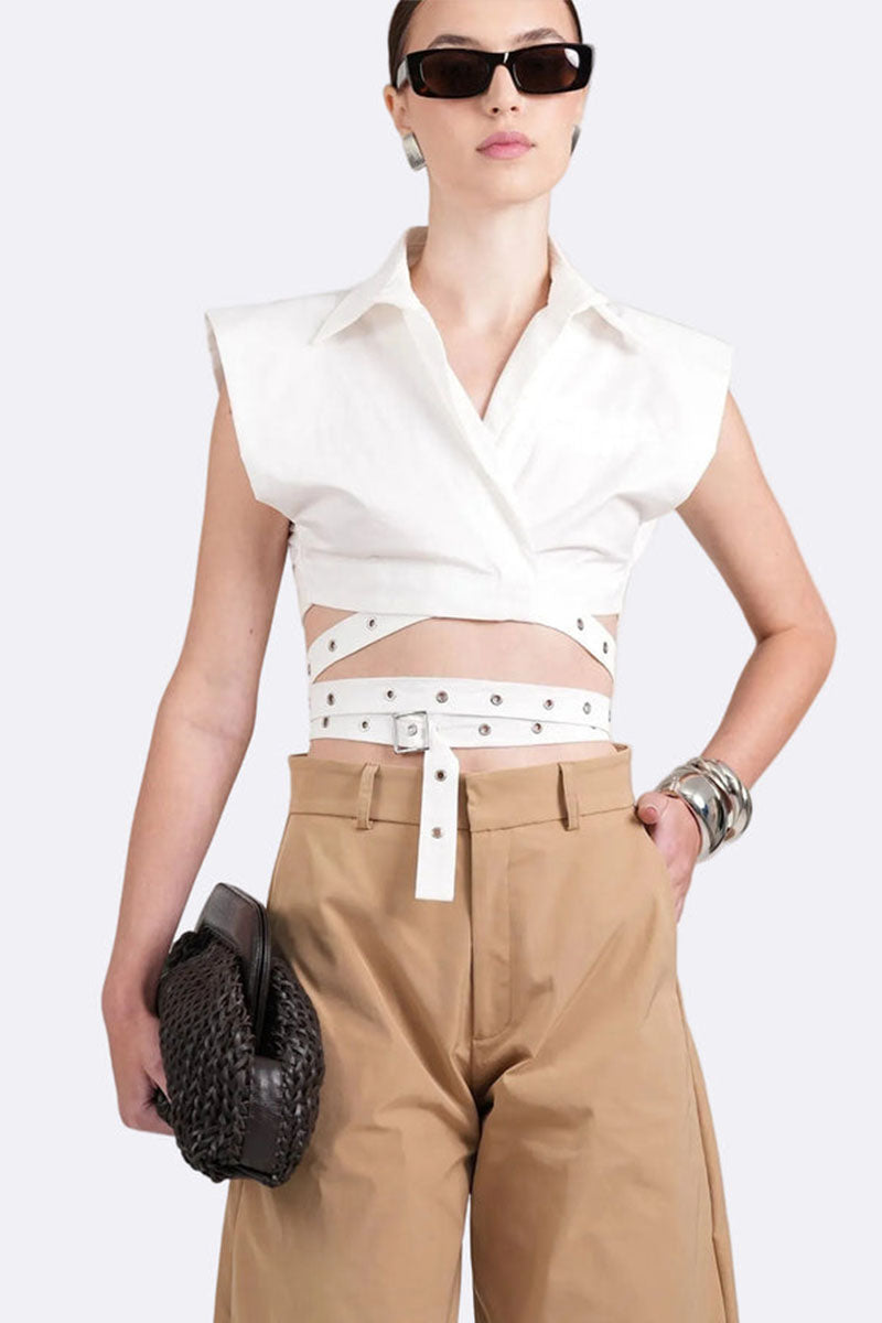 The Terry Crop is a sleeveless, wrap-style crop with an adjustable belt detail. Made from a soft yet structured cotton, it features a crisp collar and defined shoulders.
