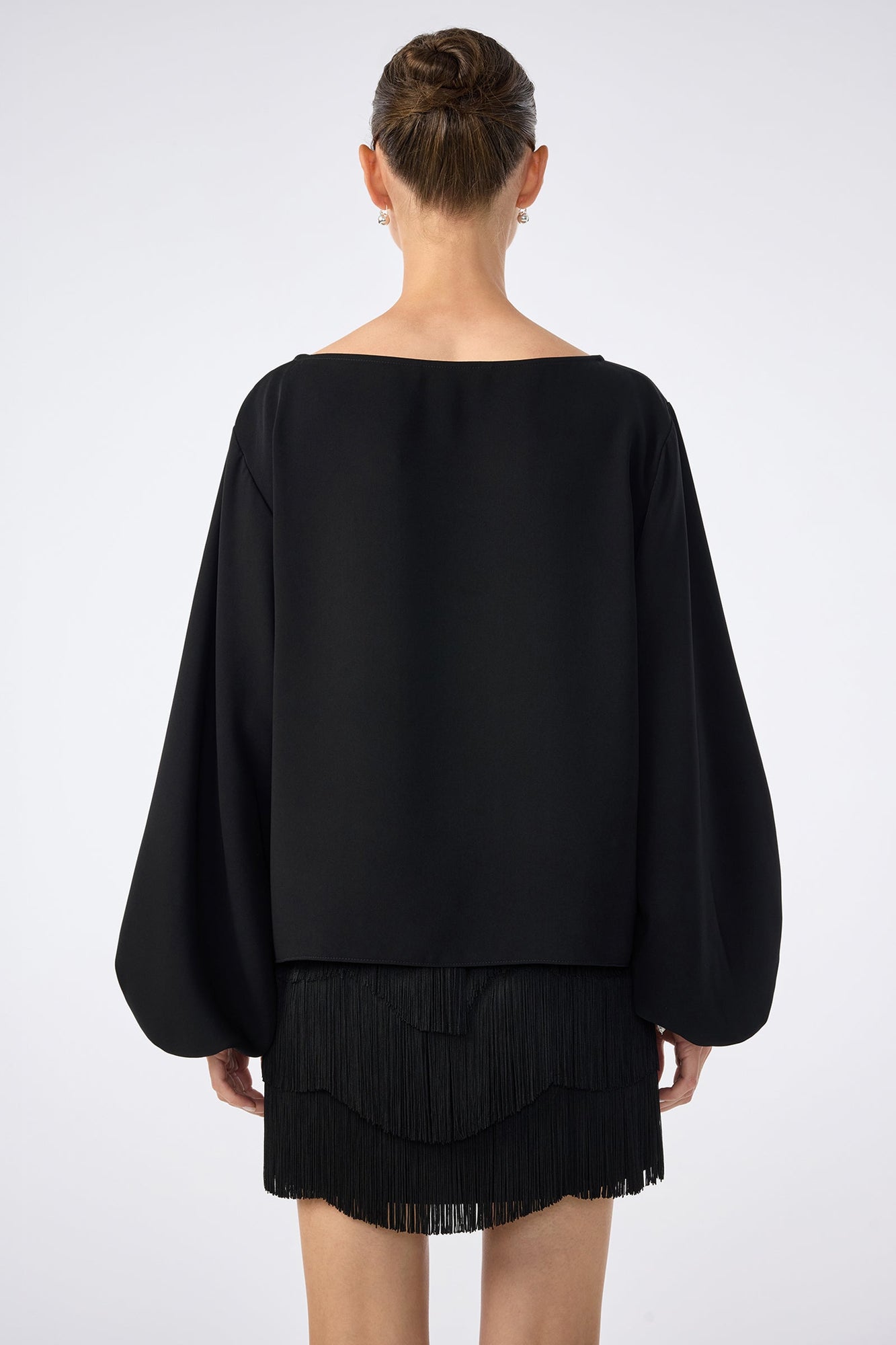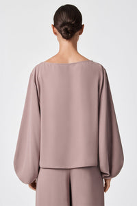 Drapey double georgette fabric adds elegance to this long-sleeved blouse with a flattering boatneck, long balloon sleeves, and a relaxed fit. Mix and match this sleek essential top with printed or neutral bottoms all year round.