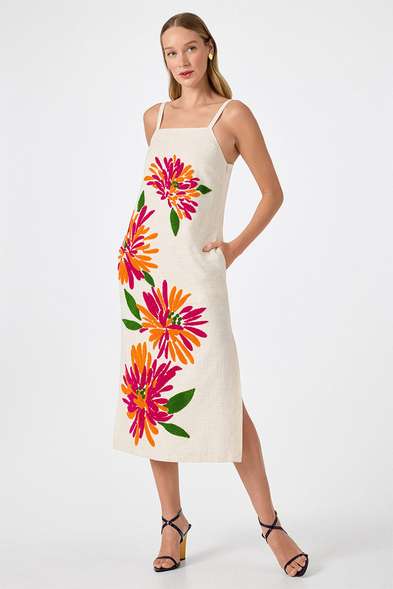 This charming floral embroidered dress is made of lightweight cotton voile and finished with moss stitch embellishment. The cami neckline and relaxed fit make this dress an effortless style for all your summer activities. It is finished with a side slit, adjustable straps, and side seam pockets.